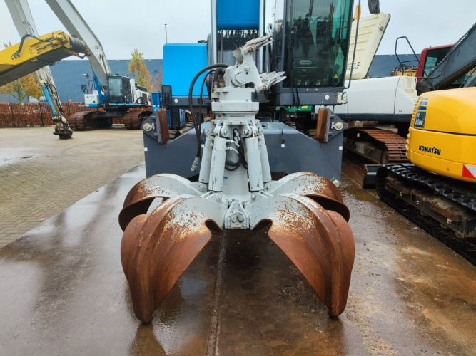 Грейферный погрузчик Fuchs MHL360F – год выпуска 2019, наработка 820 часов, подъемная кабина, цельнолитые колеса, стрела изогнутая 18м. Цена в РФ 540000 евро, включая НДС.
