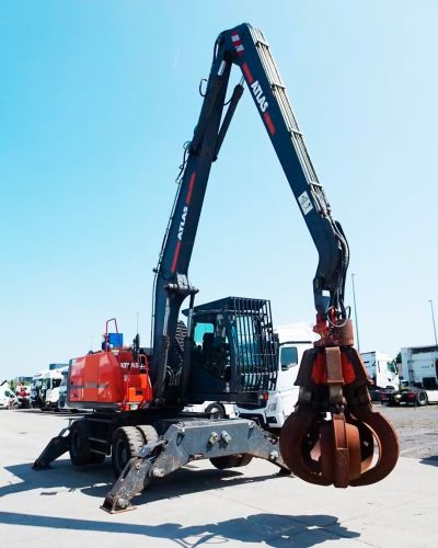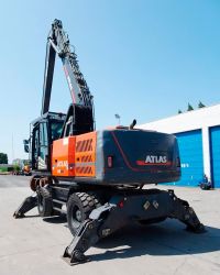 Грейферный погрузчик Atlas 250MH – год выпуска 2018, наработка 9400 часов, подъемная кабина, цельнолитые колеса, стрела 11м, генератор, грейфер. Цена в Пскове 192000 евро, включая НДС.