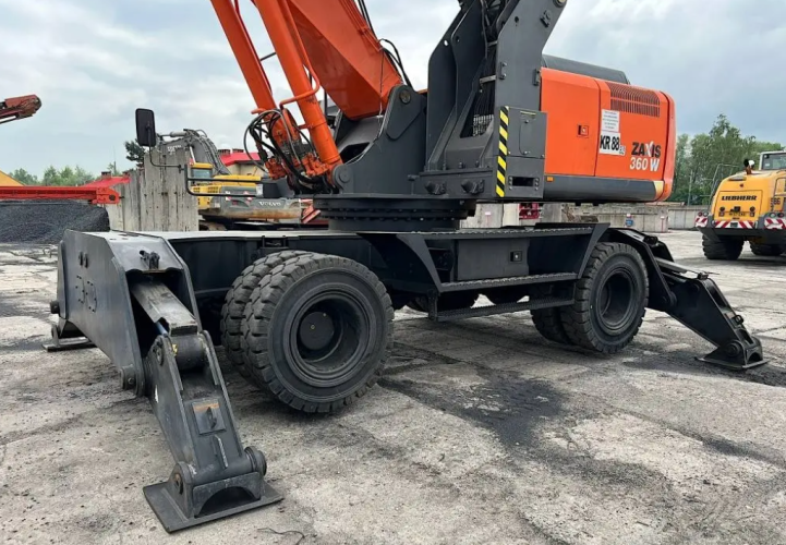 Hitachi ZX360W – год выпуска 2012, 16000 часов, подъемная кабина, цельнолитые колеса, стрела 16м, грейфер. Цена в РФ 17,5 млн. рублей, включая НДС.