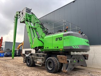 Грейферный погрузчик Sennebogen 870M – год выпуска 2018, наработка 11000 часов, подъемная кабина, цельнолитые колеса, стрела изогнутая 23м. Цена в РФ 870000 евро, включая НДС.